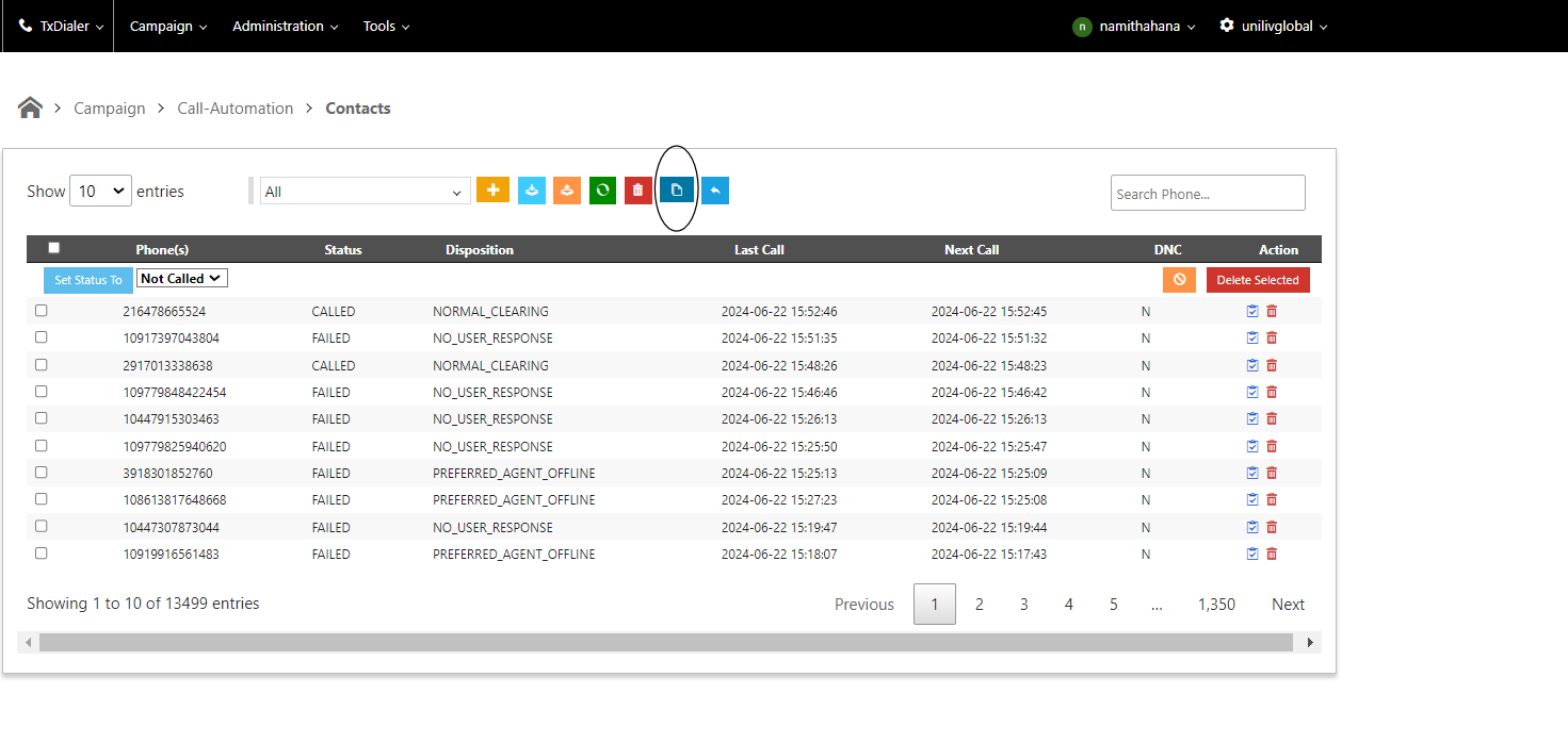 8. All the bottom line icons are used for manually getting filtered actions. Like Rechurn is used for redialing the failed contacts, Archive is to archive the contacts, Delete is used for deleting, Set status is used for changing the contact status to "called" "not called" etc. Run DNC is to check the duplicate and Export is to export the contact file.