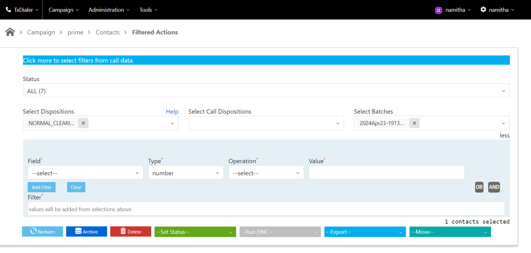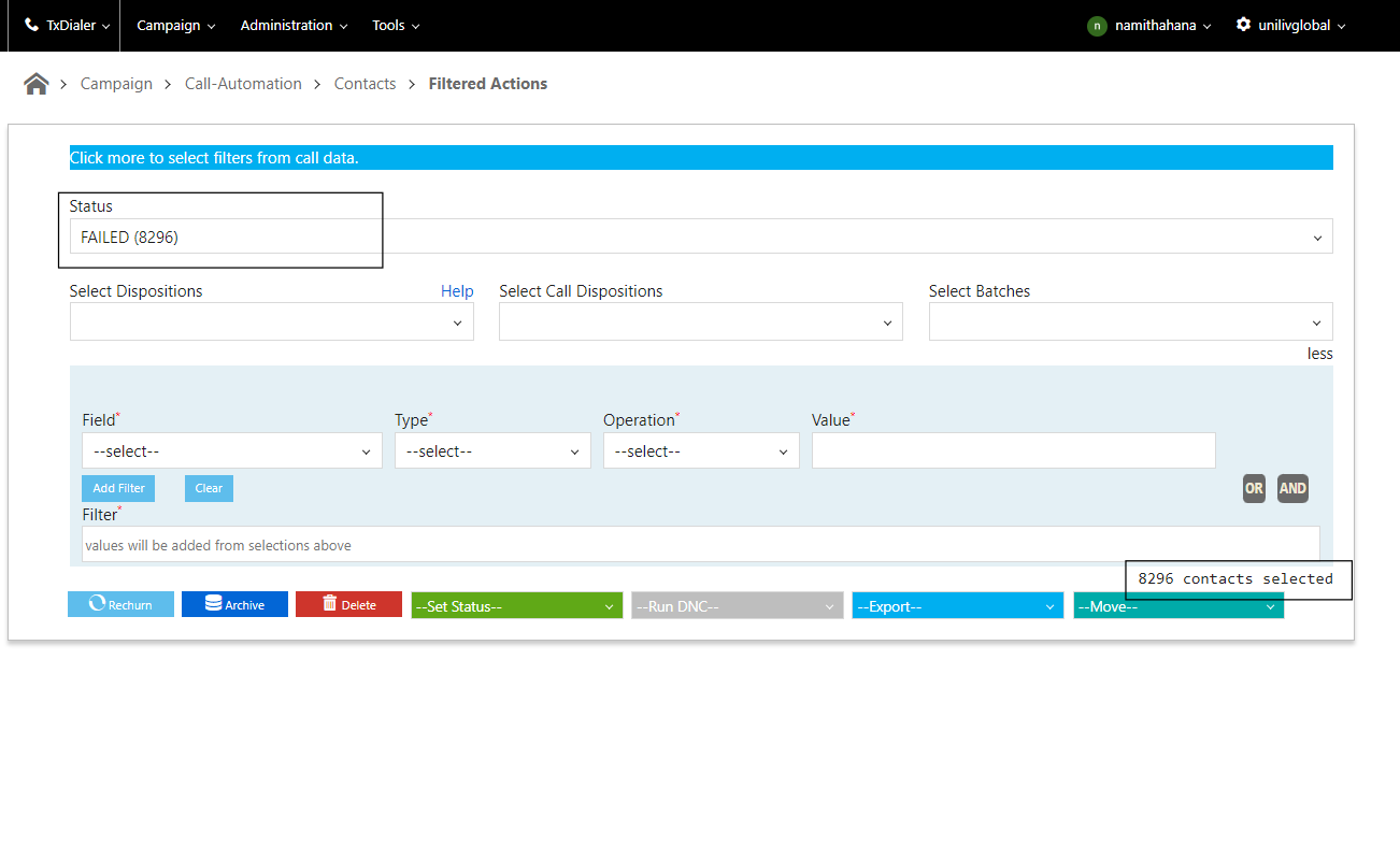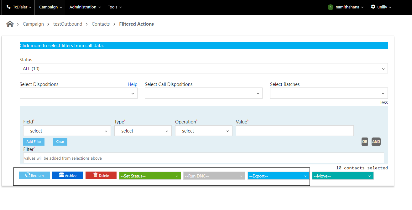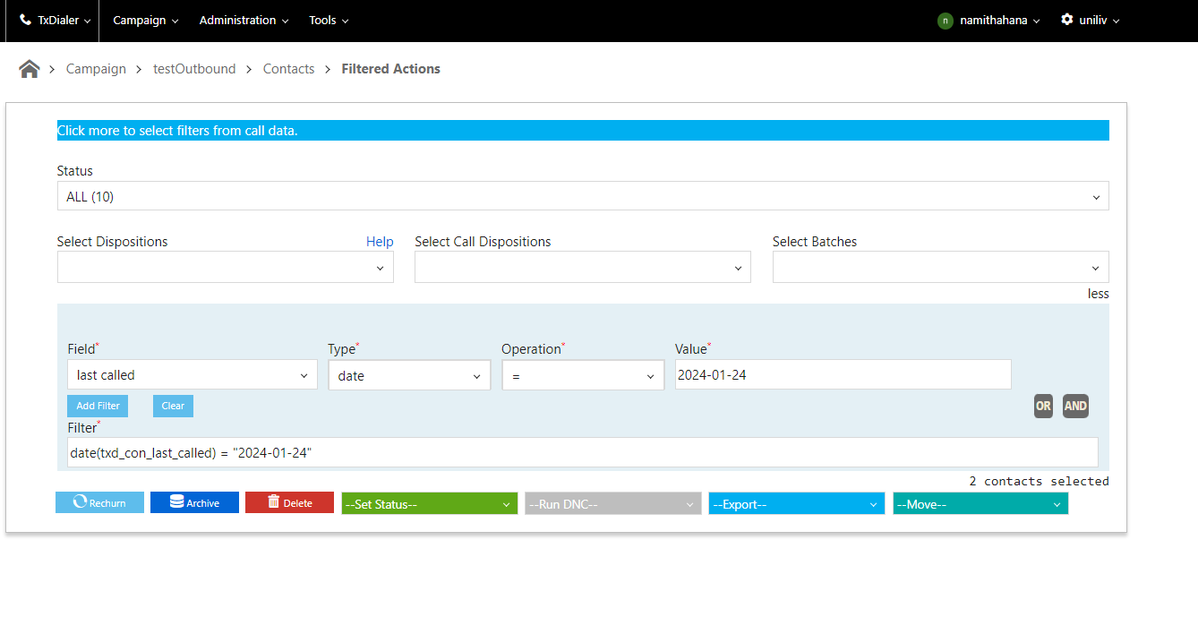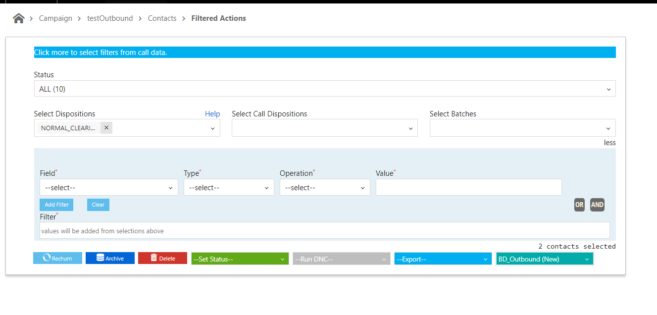 5. "Move" using this we can move the filtered contact from one campaign to another. for example here we can move 2 filtered contacts of testOutbound campaign to BD_Outbound campaigns in the dropdown list.