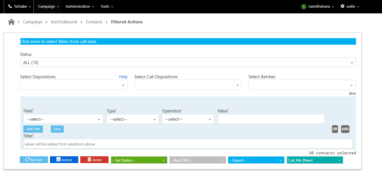 6. "New" will delete all the existing contacts from the selected campaign in the dropdown below and add new filtered contacts to the selected campaign. For ex: here 10 contacts of testOutbound is added to Call_Me campaign.