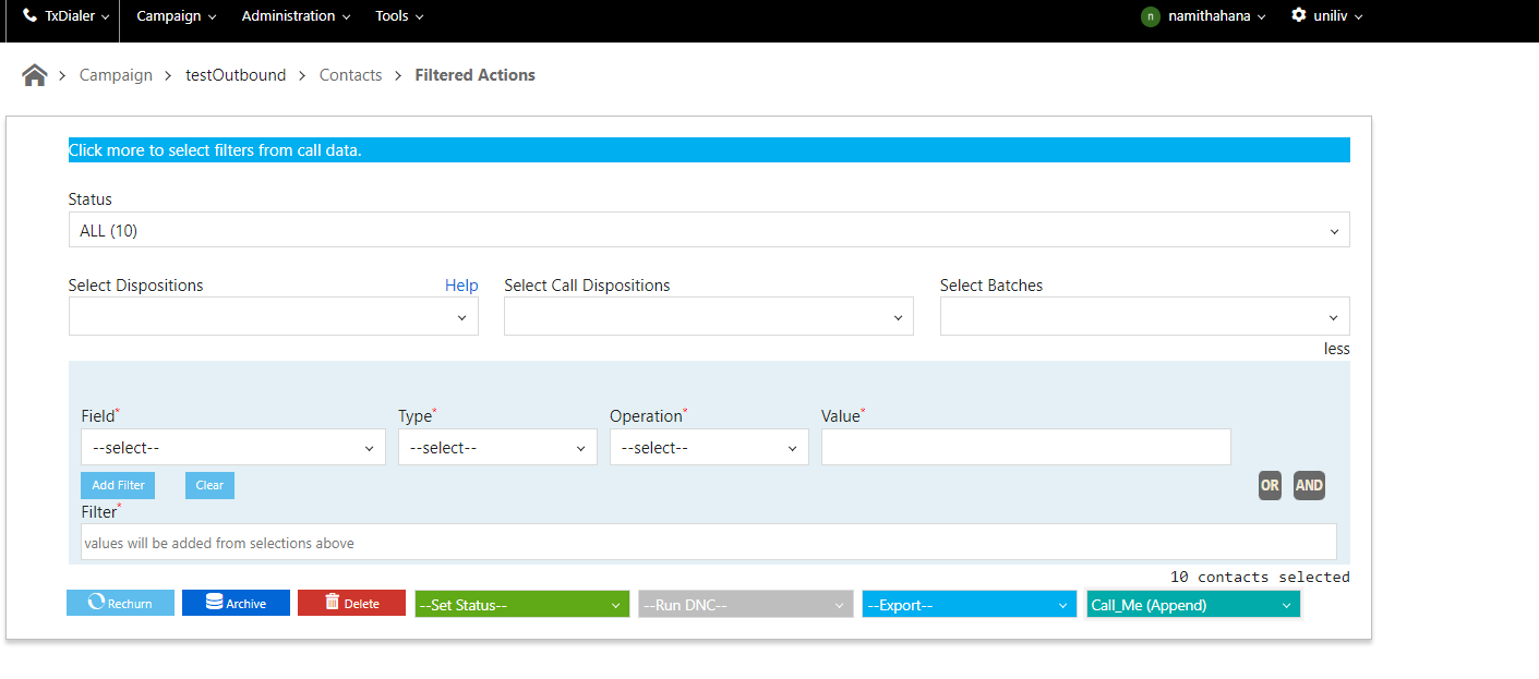 7. "Append" - it will append filtered contacts to existing contacts of the selected campaign in the dropdown list below. For ex: here 10 contacts of testOutbound campaign is appended to Call_Me campaign.